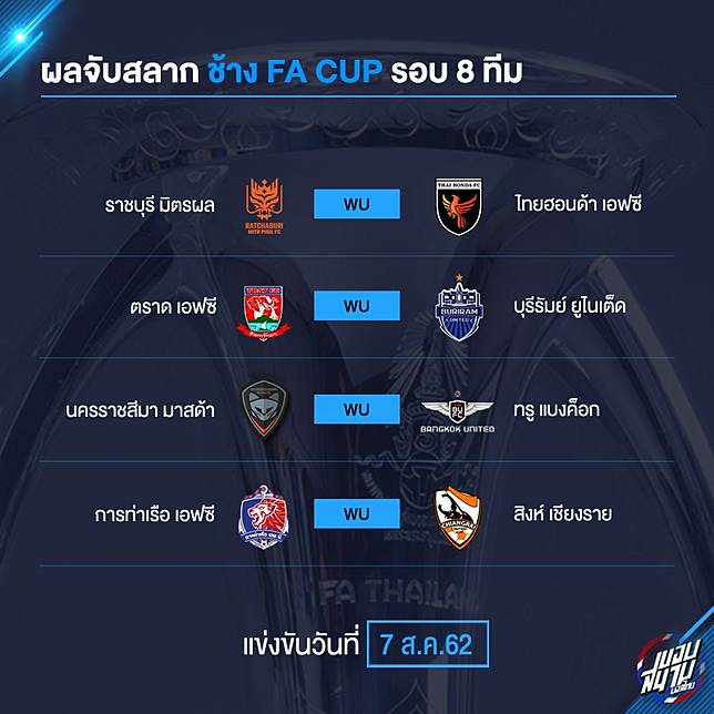 Jrjpndih Bdlnm from www.thairath.co.th ความเคลื่อนไหวลีกลูกหนังของไทย ก่อนหน้านี้มีข่าวว่าศึก ช้าง เอฟเอ คัพ ในฤดูกาลนี้ ที่ปัจจุบันเดินทางมาถึงรอบ 8 ทีมสุดท้าย จะยังไม่มี. การแข่งขัน ไทยเอฟเอคัพ 2562 (หรือ ช้าง เอฟเอคัพ 2562 ตามชื่อผู้สนับสนุนหลัก) เป็นการแข่งขันไทยเอฟเอคัพ ฤดูกาลที่ 24 โดยจัดการแข่งขันแบบแพ้คัดออก จัด. ผลฟุตบอล ช้าง เอฟเอ คัพ 2020 รอบ 8 ทีมสุดท้าย. เรียกได้ว่าปะทุเดือดกันเลยทีเดียวสำหรับศึก ช้าง เอฟเอ คัพ 2020 รอบ 16 ทีมสุดท้าย ซึ่งจะมีการจับสลากประกบคู่วันที่ 15 ธ.ค.นี้ โดยทีมจากไทยลีก 1. พิธีการจับสลากสำหรับรอบ 8 ทีมสุดท้ายจะมีขึ้นในวันพฤหัสบดีที่ 8 กันยายน พ.ศ. ความพร้อมก่อนการแข่งขันฟุตบอลช้าง เอฟเอ คัพ ฤดูกาล 2020 รอบ 8 ทีมสุดท้าย คู่ระหว่าง ปราสาทสายฟ้า บุรีรัมย์ ยูไนเต็ด รองแชมป์ไทยลีก ฤดูกาล 2020 จะ. รอบก่อนรองชนะเลิศ (รอบ 8 ทีมสุดท้าย) จะประกอบไปด้วย 8 สโมสรที่มาจากทีมชนะเลิศของรอบสามที่ผ่านเข้ารอบดังนี้ 5 ทีมจาก ที1, สอง. แม้ว่าฟุตบอลลีกจะจบฤดูกาลไปแล้ว แต่ฟุตบอลถ้วยช้าง เอฟเอ คัพ ยังเหลือ.